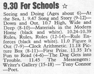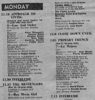 Here's a clipping from a newspaper, dated 24th March 1969. Schools programmes started much later in the day than in later years (and indeed currently) and continue on into the afternoon.
